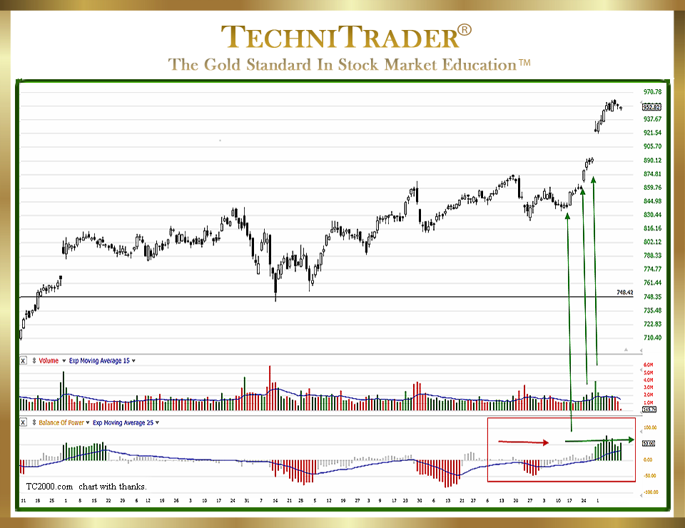 Once a stock has gapped often hugely, the gains of that momentum run are limited at best. Entering before a huge gap should be the goal. Balance of Power provides the data needed to let you know when a stock is poised for momentum action.