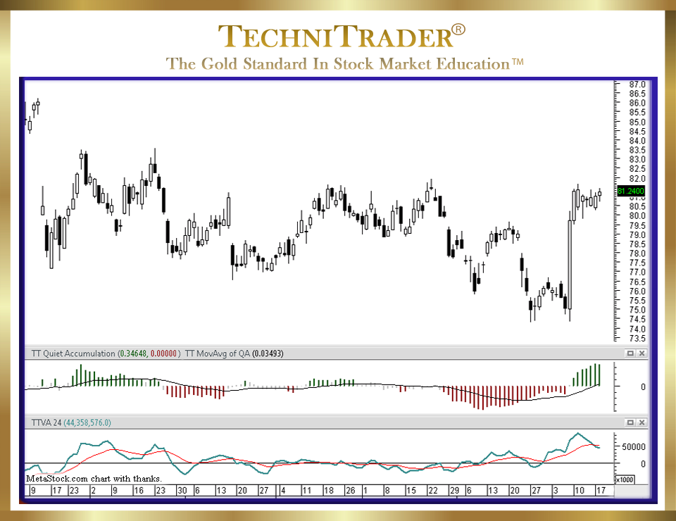 Then, price dropped into a Dark Pool Buy Zone™, which triggered the giant Buy Side Institutions’ Time Weighted Average Price (TWAP) orders. In the Basing Bottoming Formation, the giant Buy Side Institution orders buy large-lot shares of stock incrementally over time while maintaining a bracketed price range. This minimizes the impact of their buying on stock Volume and Price, barely moving price as shown in the TechniTrader Quiet Accumulation (TTQA) indicator.