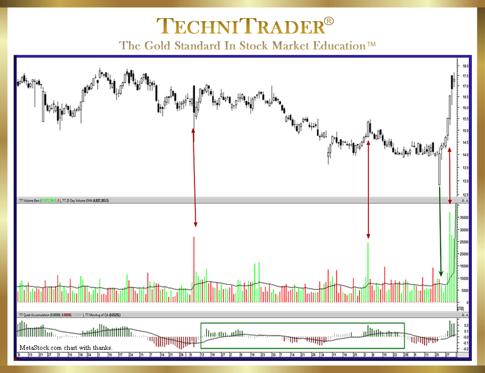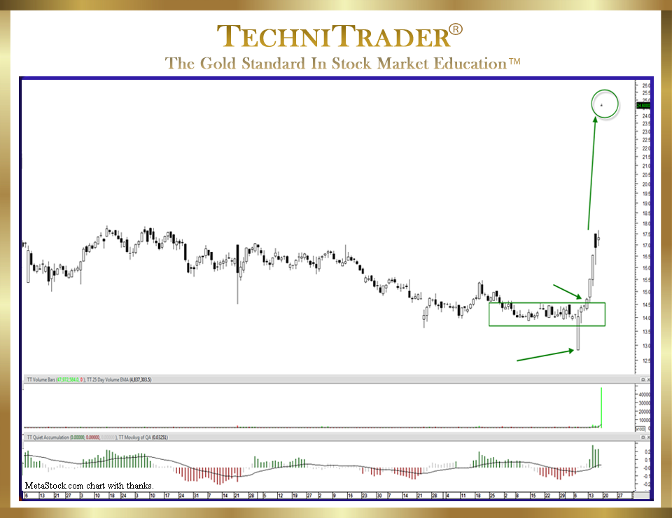 Using an indicator that exposes the Dark Pool incremental buying gives Retail Traders an edge even High Frequency Traders (HFTs) do not have. During this period, the stock slipped down slightly, but it remained well within the Dark Pool Buy Zone™ that had been created. Below is a chart example of a stock under Dark Pool Quiet Accumulation for several months.